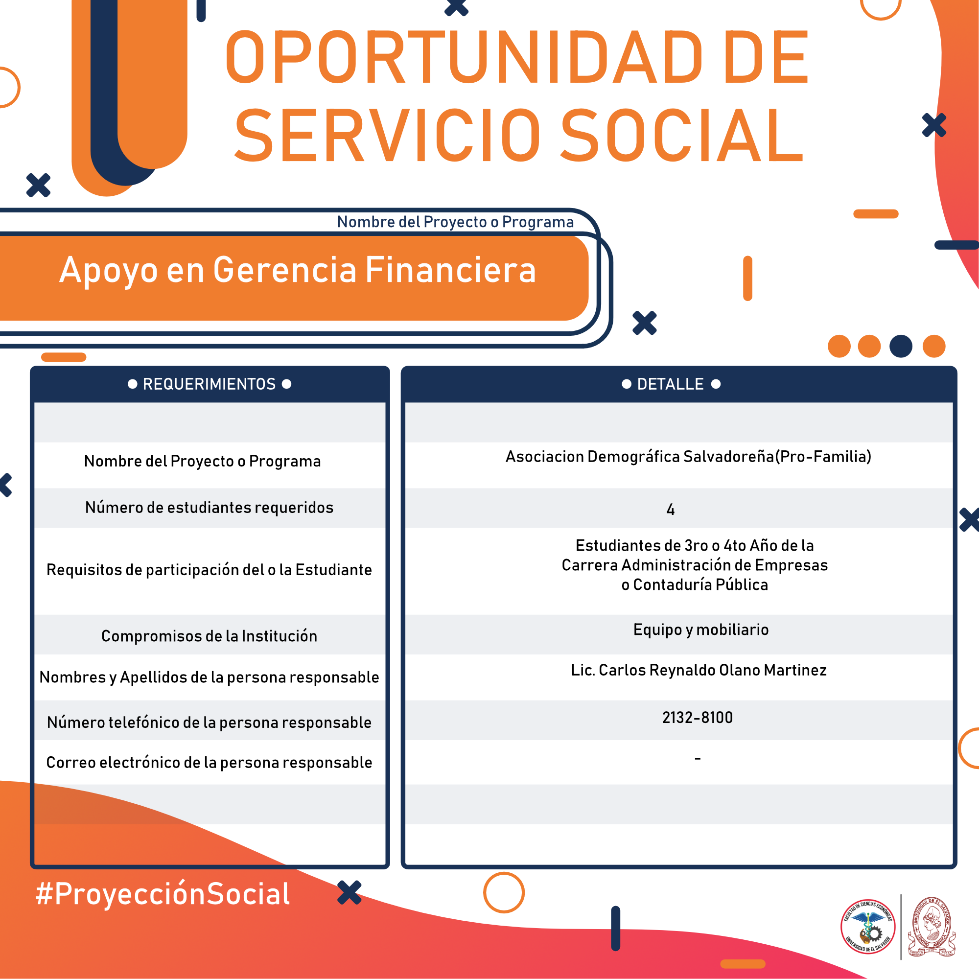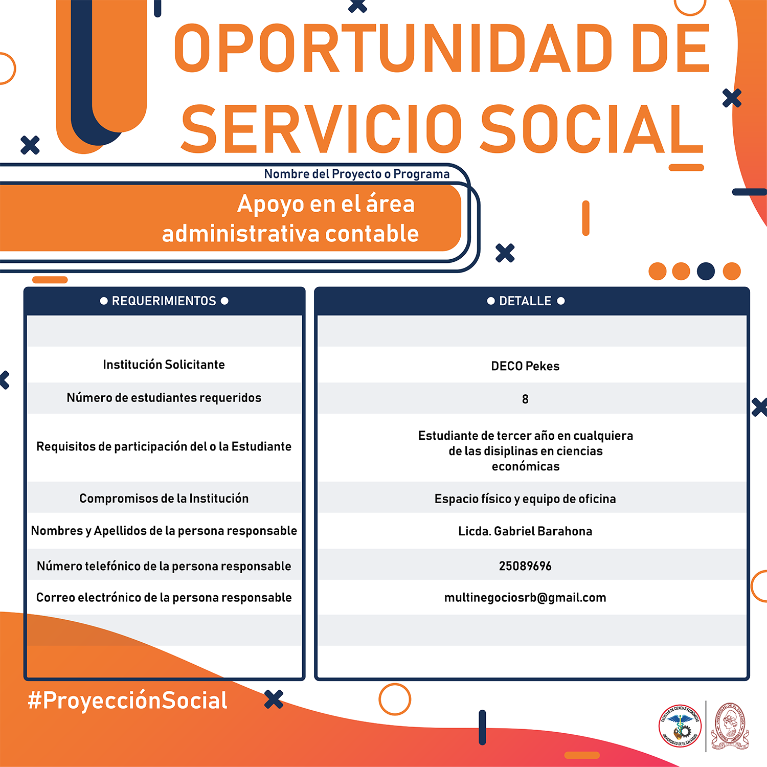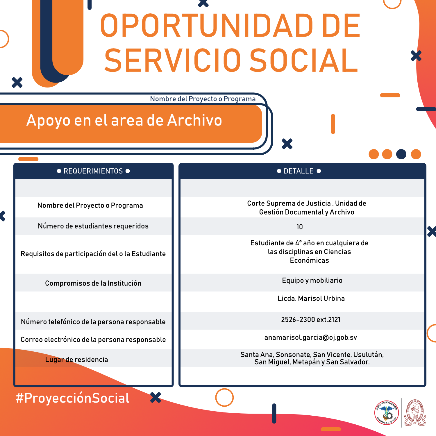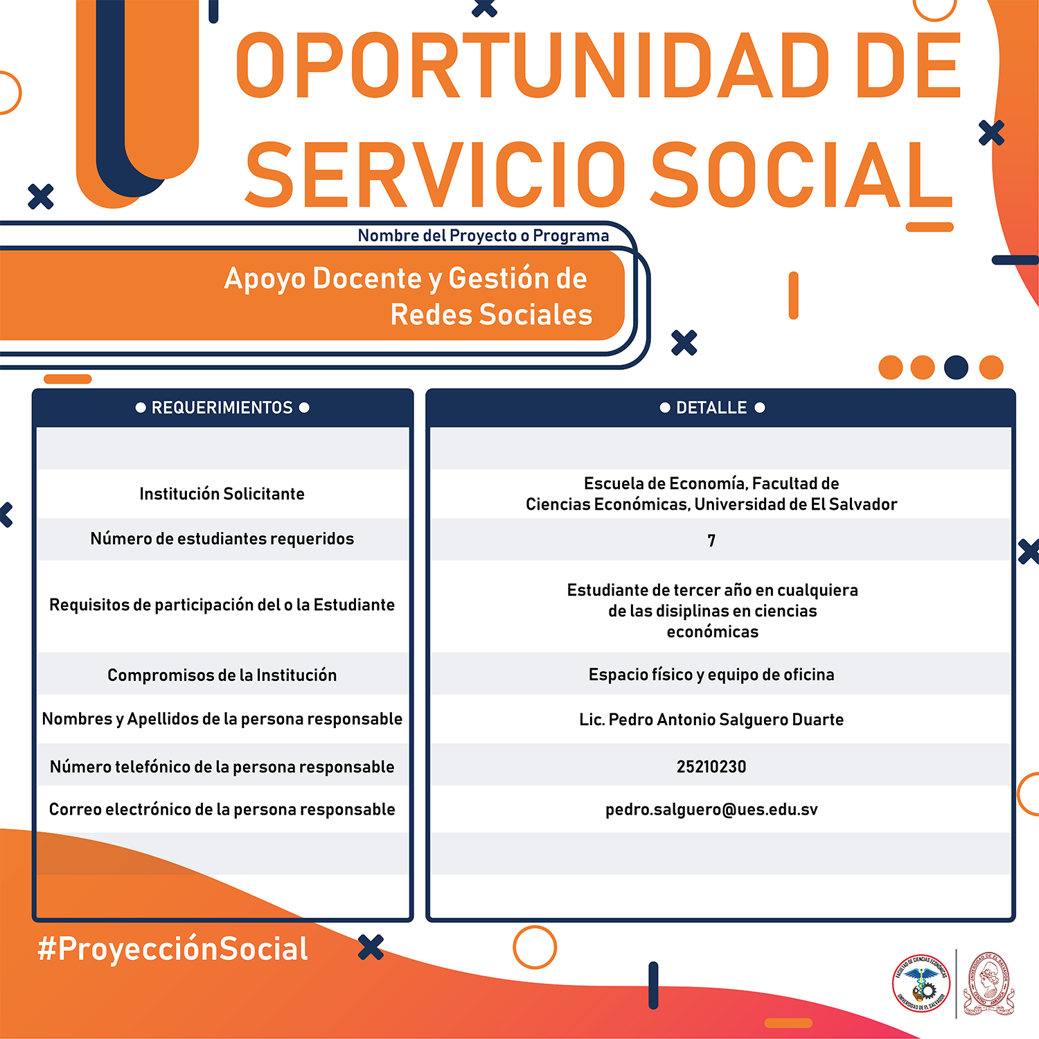 #Importante Una vez aceptado el proyecto con la respectiva institución, debes confirmar la aceptación con nuestra Unidad de Proyección Social llamando al 2521-0220 o escribe a: proyeccionsocial.economia@ues.edu.sv