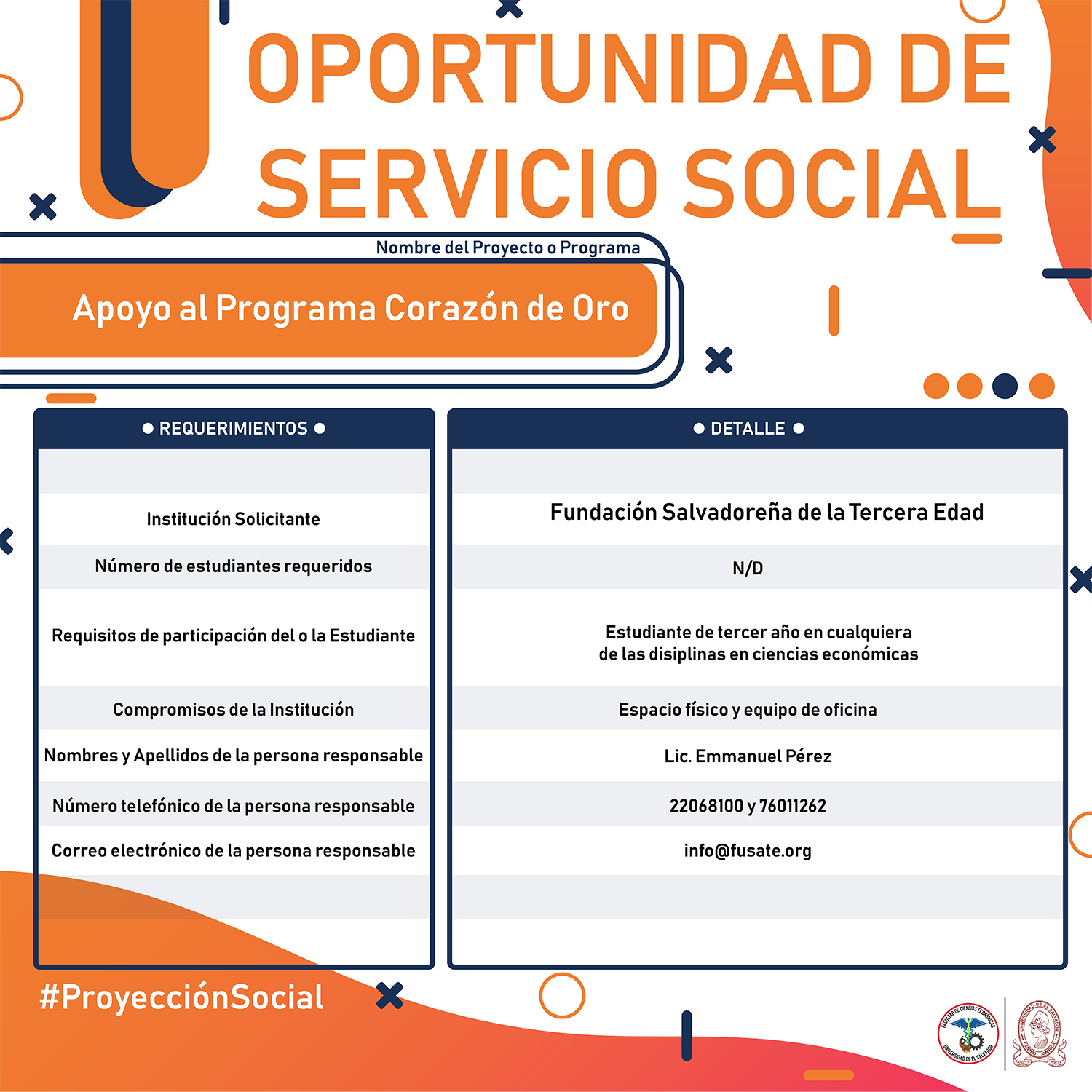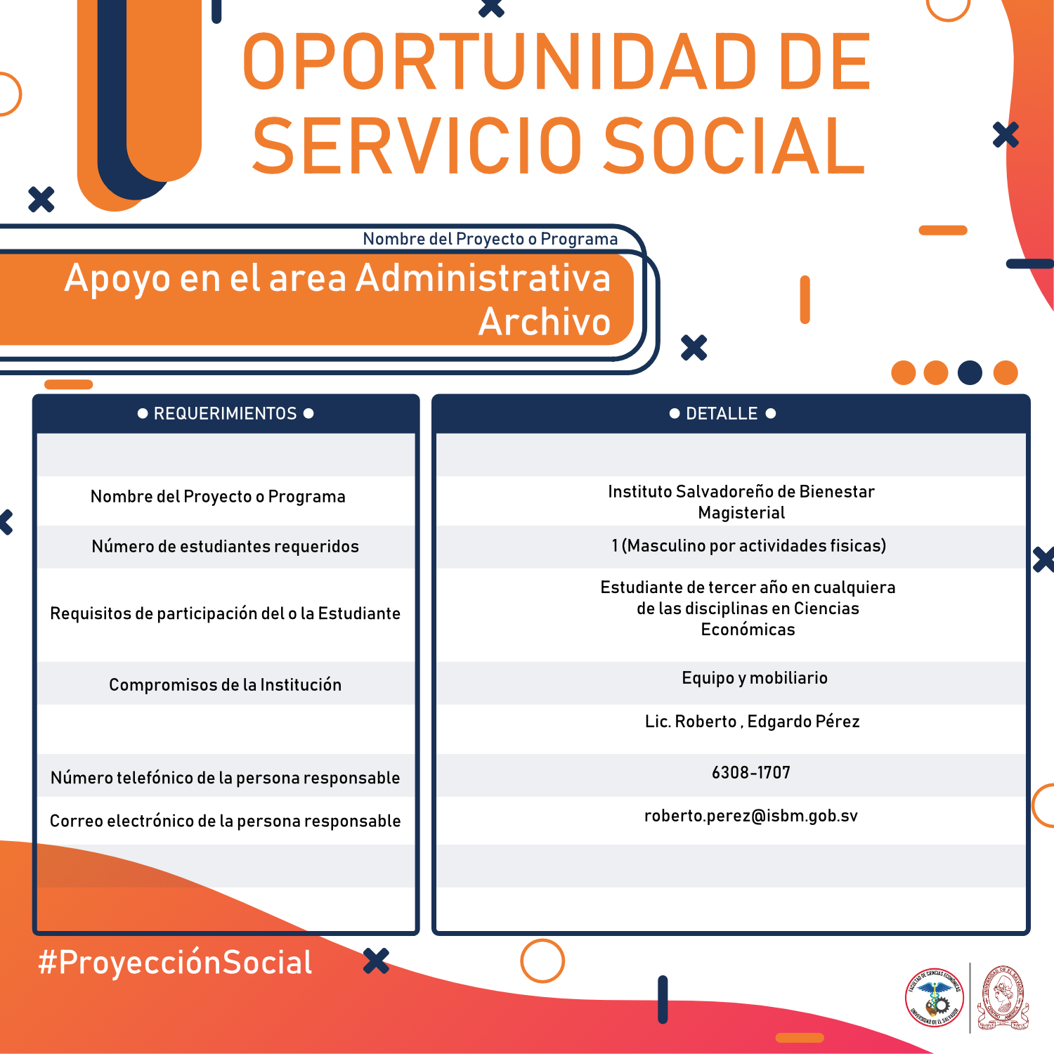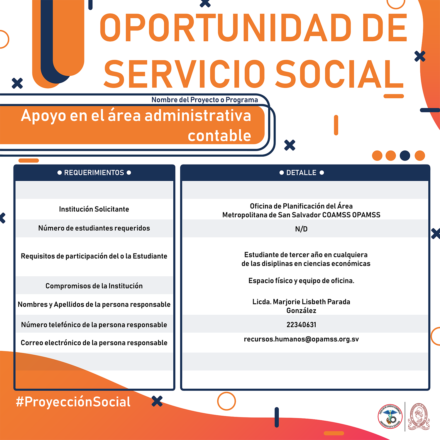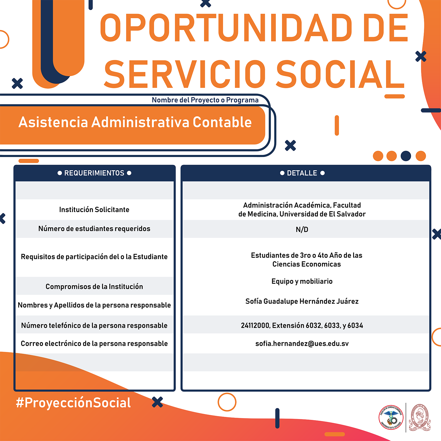 #Importante Una vez aceptado el proyecto con la respectiva institución, debes confirmar la aceptación con nuestra Unidad de Proyección Social llamando al 2521-0220 o escribe a: proyeccionsocial.economia@ues.edu.sv