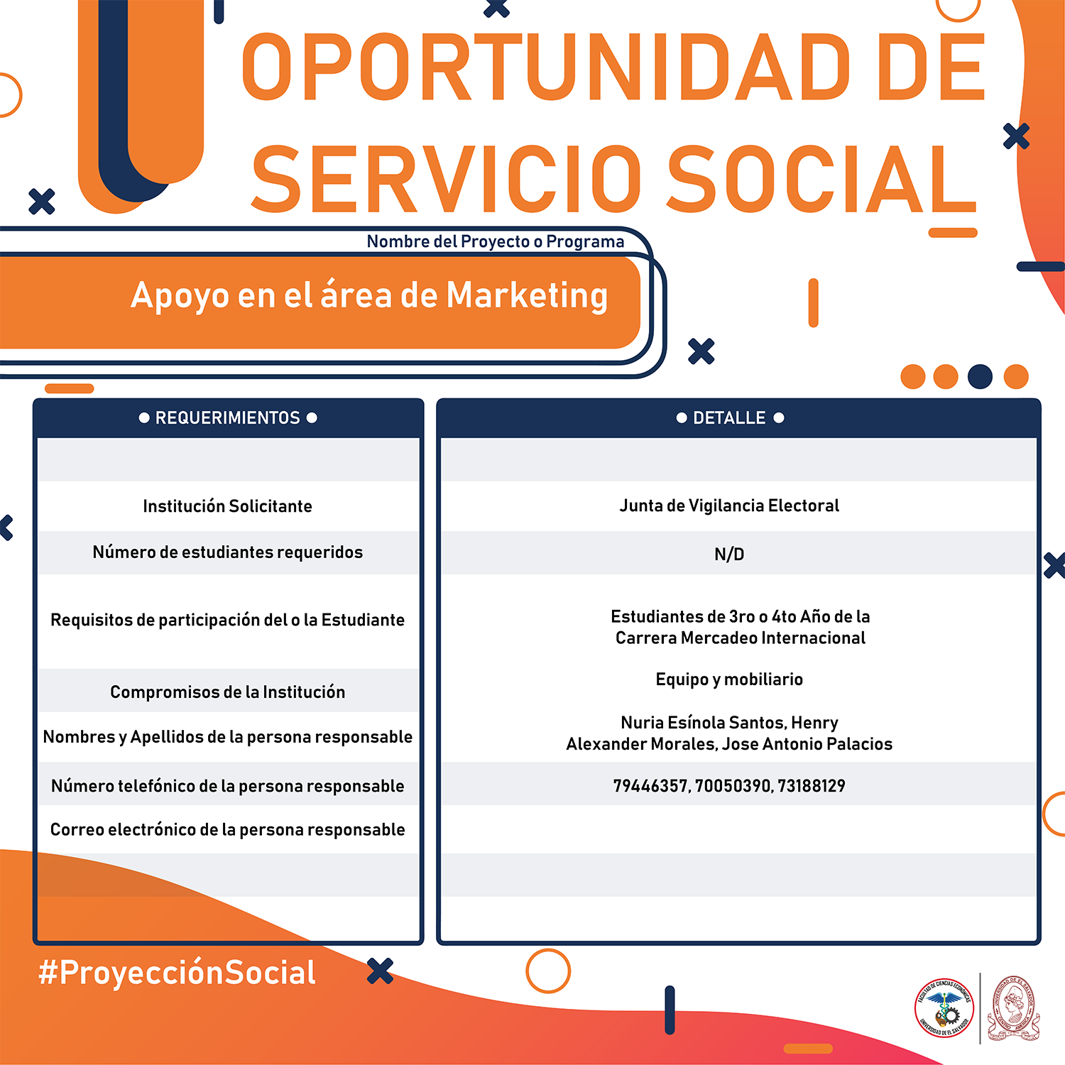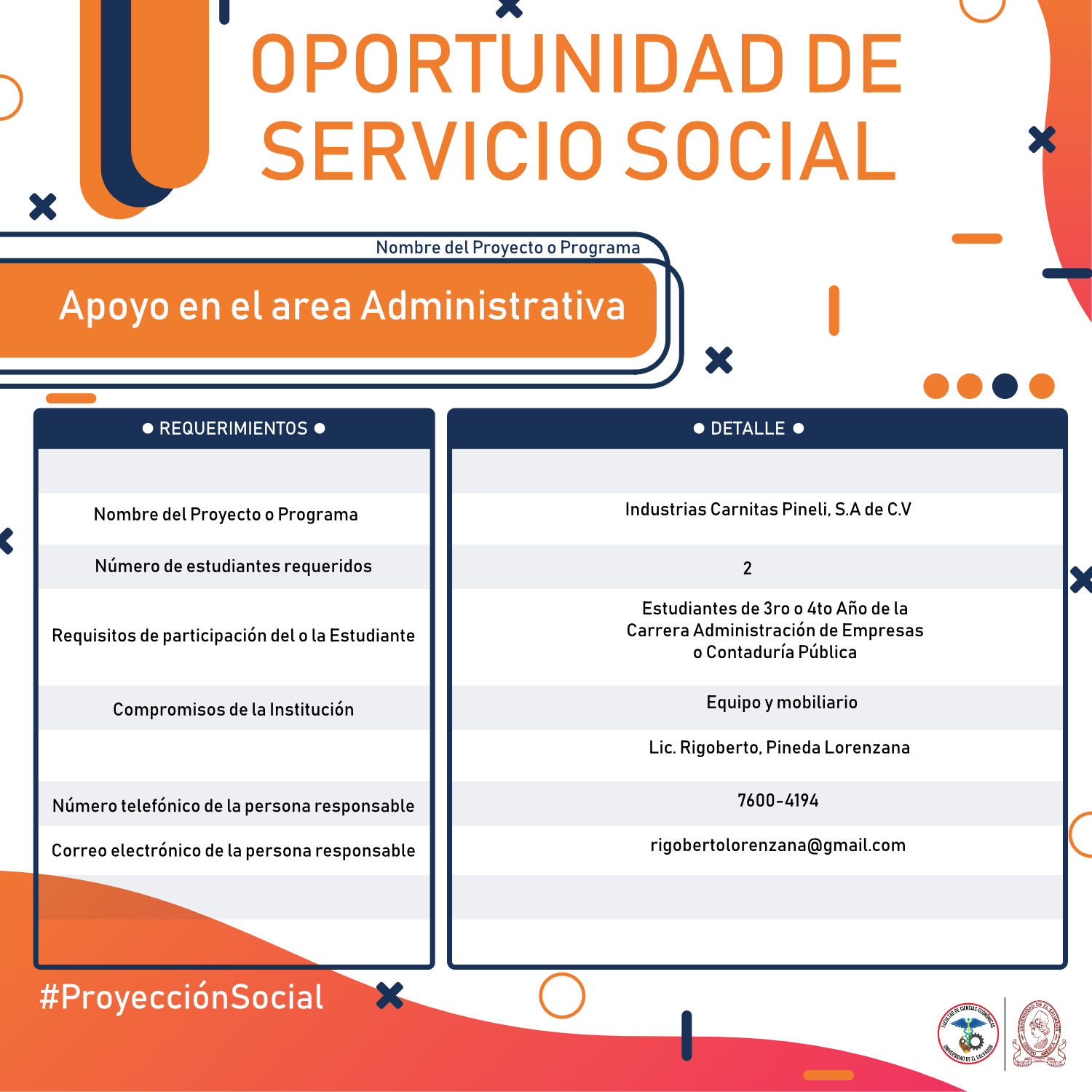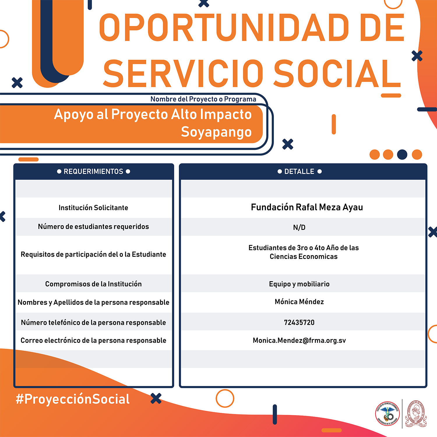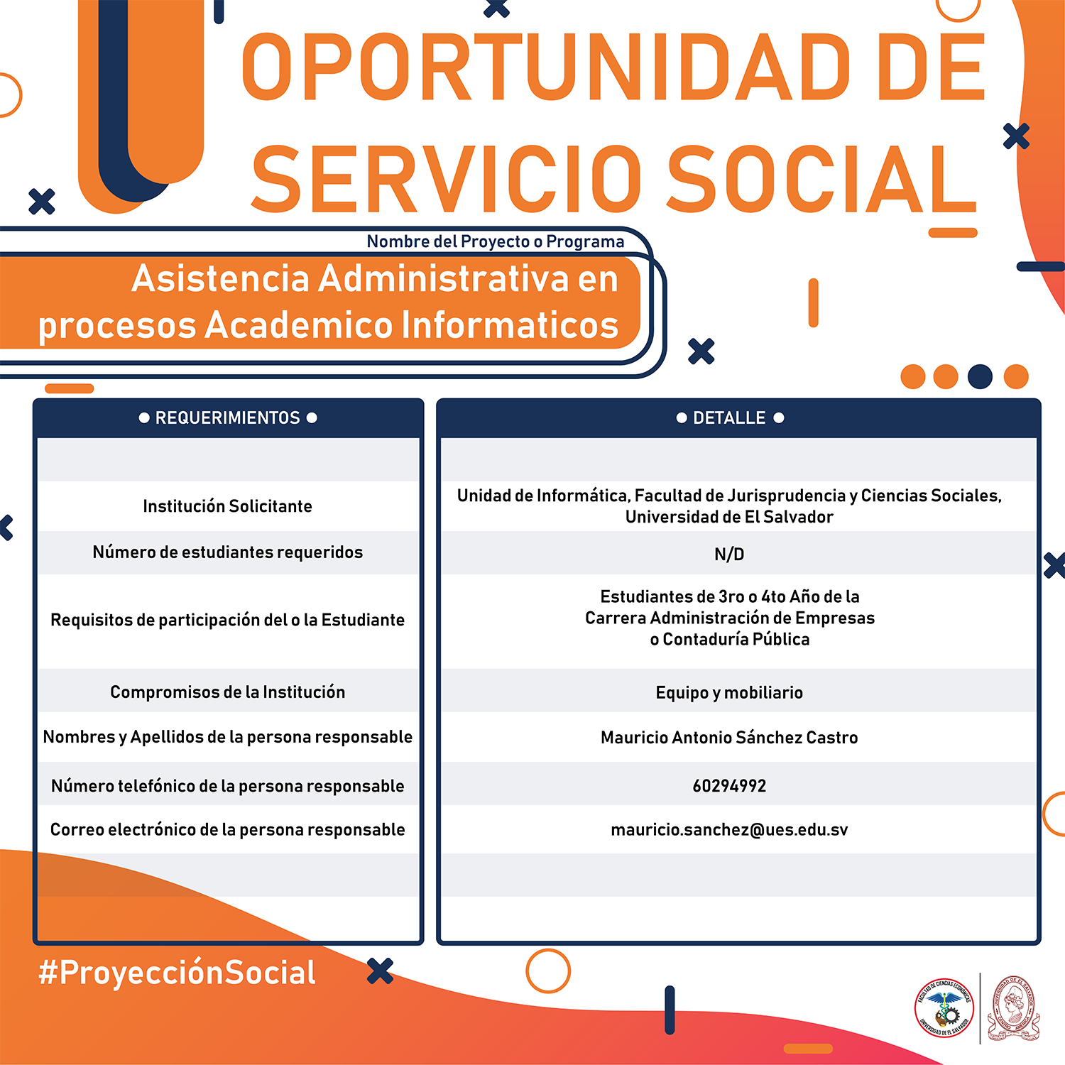 #Importante Una vez aceptado el proyecto con la respectiva institución, debes confirmar la aceptación con nuestra Unidad de Proyección Social llamando al 2521-0220 o escribe a: proyeccionsocial.economia@ues.edu.sv